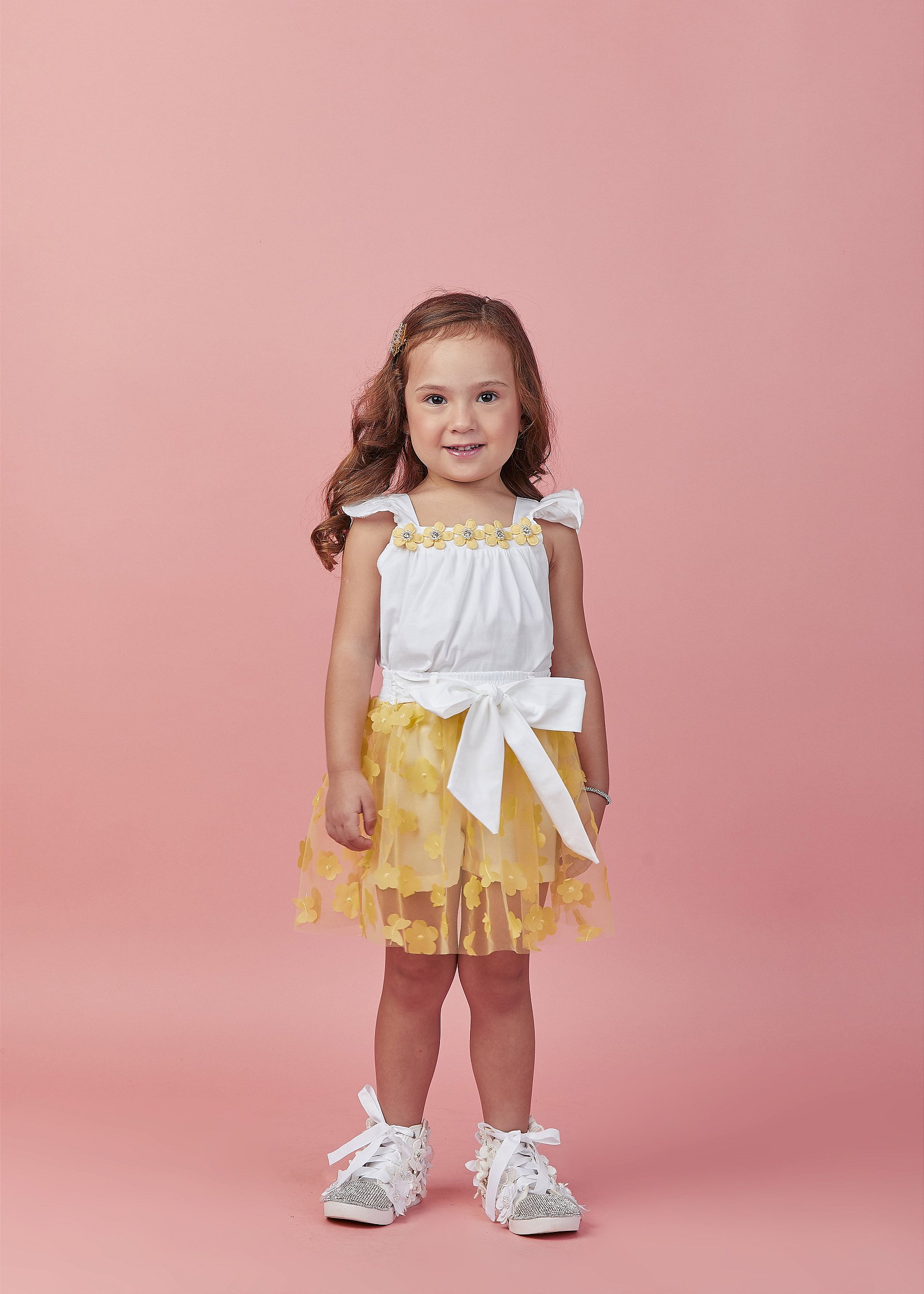 Conjunto saia amarela borboleta 3D e blusa em tricoline