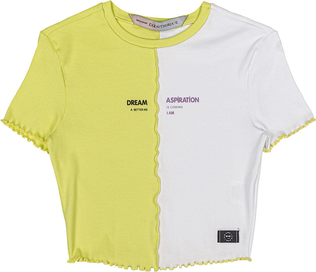 Blusa bicolor neon e off white, modelo cropped, estilosa, em malha canelada, 100% algodão e tendência da moda teen.
