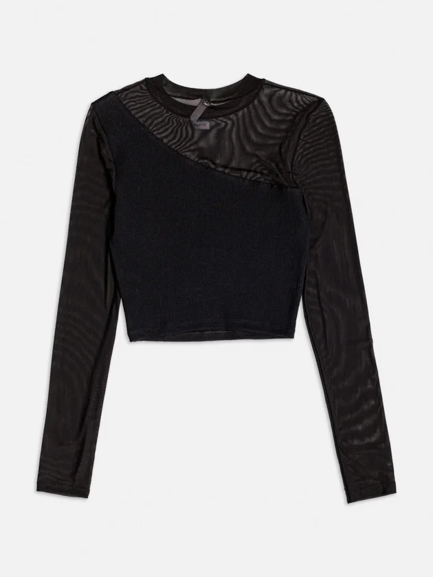 Fashion de impacto! A blusa preta traz manga longa em tule e recorte assimétrico com um ombro só perfeita pra looks noturnos ou produções fashionistas com vibe moderna. Um statement piece total.