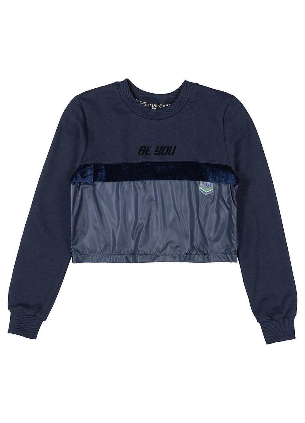 A parte superior do casaco é confeccionada em moletom azul marinho de toque macio, com destaque para a estampa em relevo “BE YOU”, que reforça a mensagem de autenticidade e empoderamento. Logo abaixo, uma faixa de tecido com acabamento aveludado em azul escuro acrescenta sofisticação e um toque diferenciado à peça.