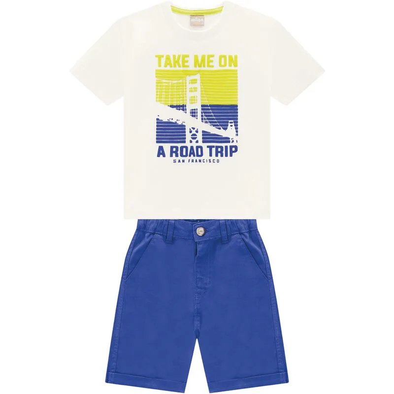 Conjunto infantil da marca Milon, composto por camiseta de manga curta em tom off-white, com estampa frontal inspirada na ponte Golden Gate em cores vibrantes de amarelo e azul, acompanhada da frase “Take Me On A Road Trip – San Francisco”, transmitindo um estilo aventureiro e moderno. Acompanha bermuda azul vibrante com cós ajustável e fechamento por botão, oferecendo conforto e praticidade. Perfeito para passeios e momentos casuais, unindo estilo e conforto para o dia a dia dos pequenos.