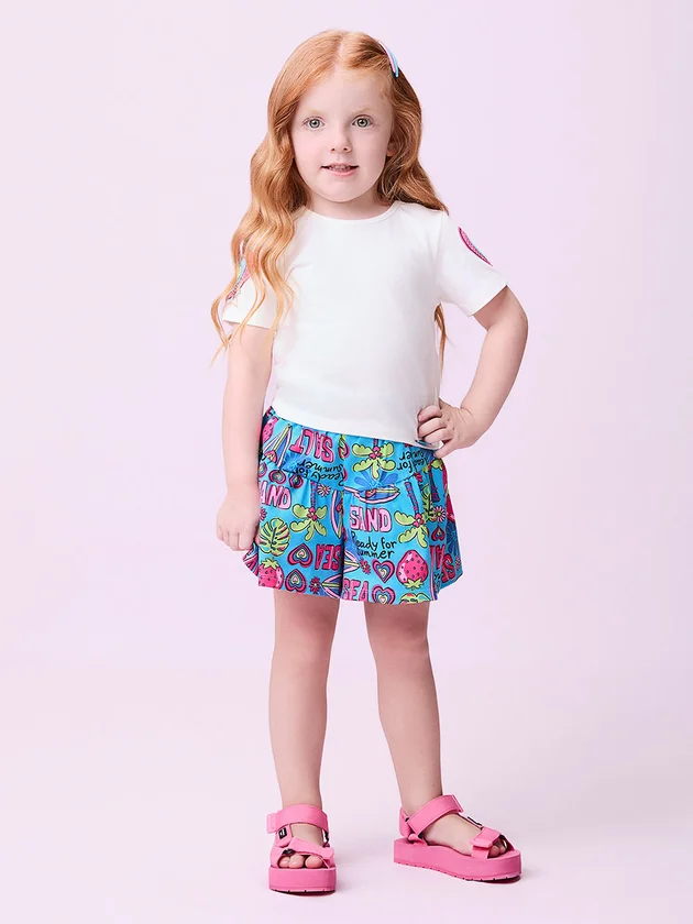 Diversão garantida com este conjunto! A blusa de cotton off white com mangas com estampa de corações e aplicação de strass é super fofa. O short amplo em cotton azul sky com estampa de temas tropicais e recortes frente e costas com franzido, é ideal para as brincadeiras das nossas meninas. Cintura com elástico funcional para garantir o máximo conforto. Ref.: J6072