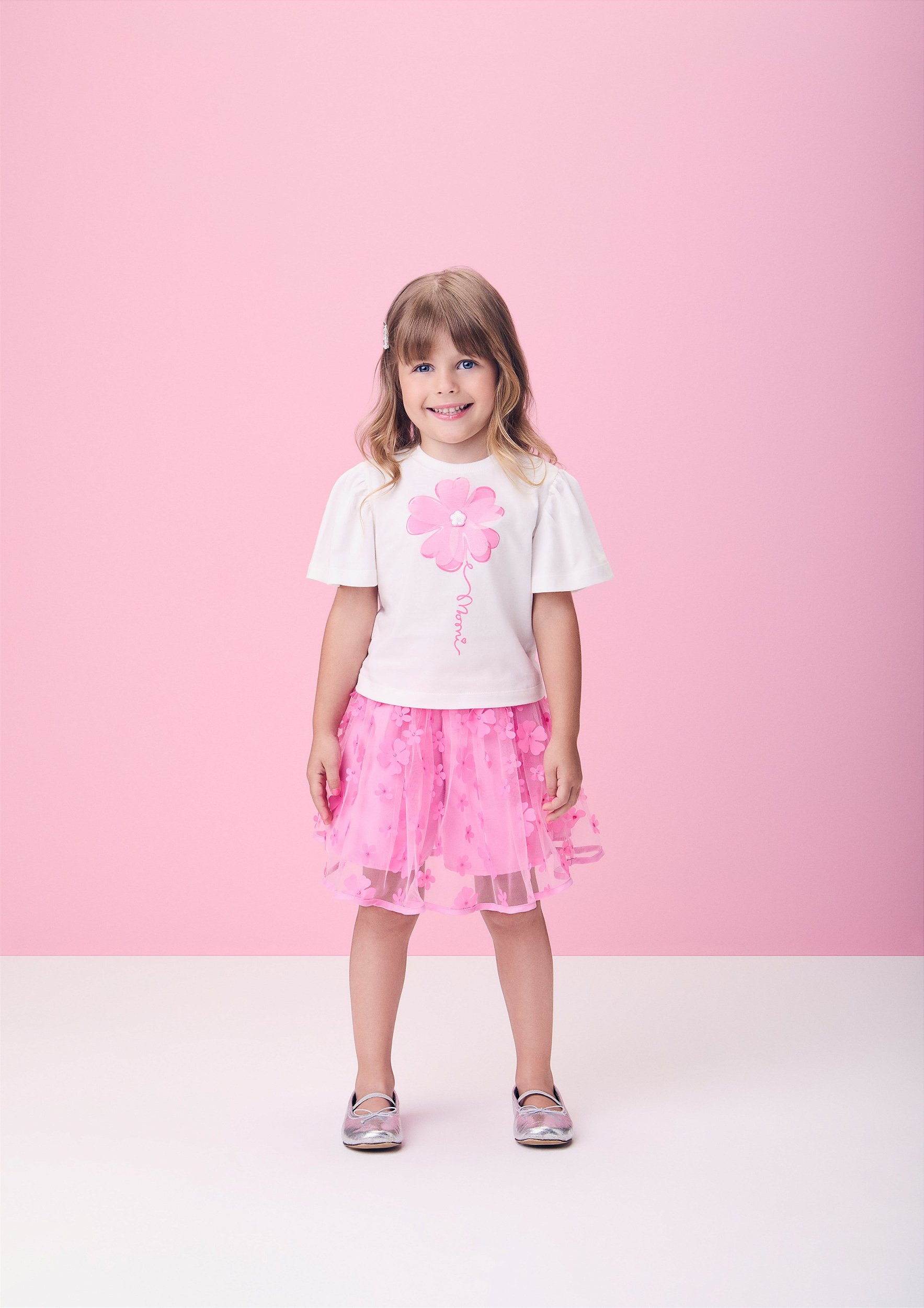 ✨ Conjunto blusa branca com uma flor e short saia de tule rosa com aplicações de flores ✨