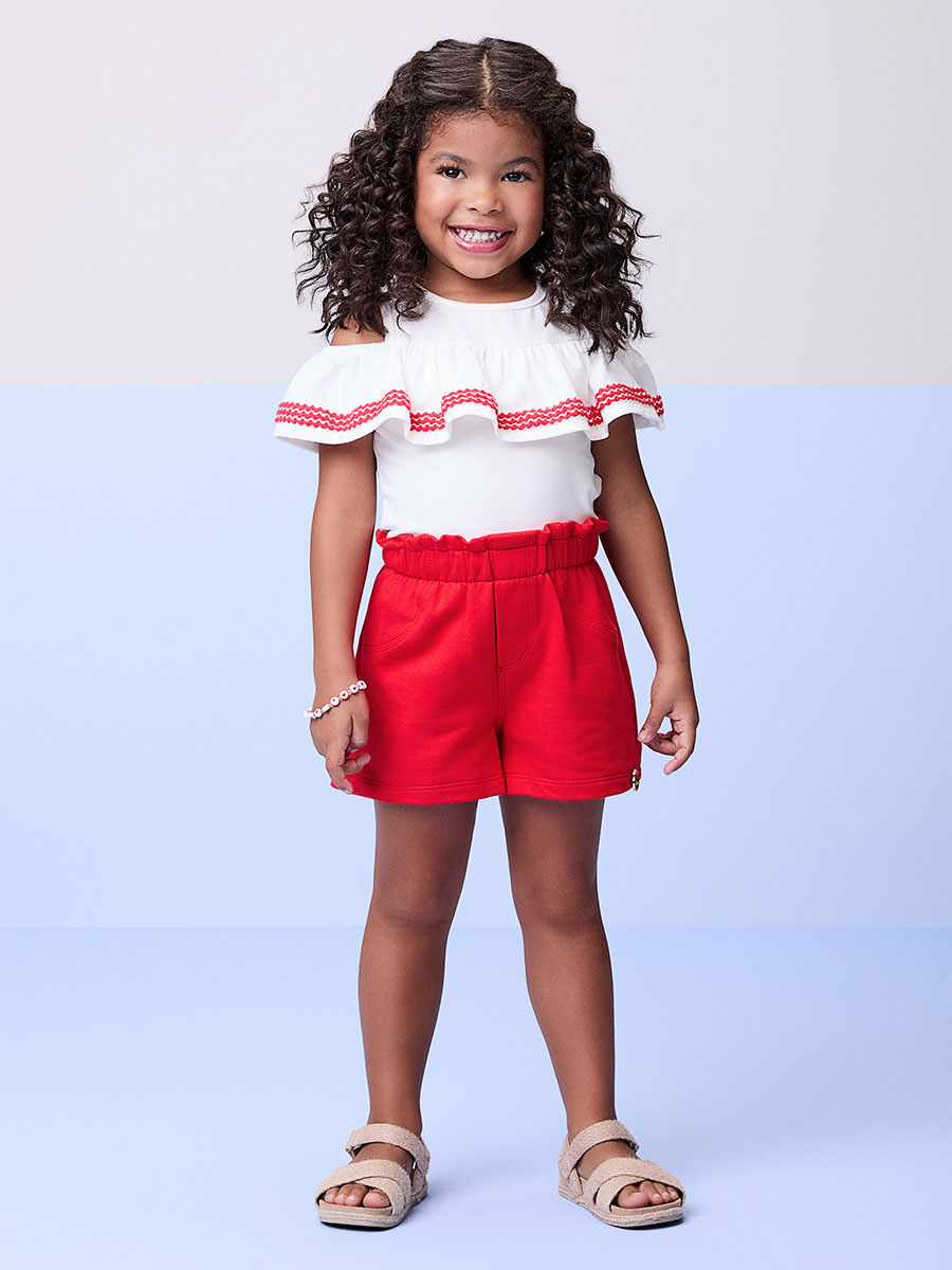 Conjunto Momi encantador composto por blusa off white com babado ombro a ombro e detalhes em zigue-zague vermelho, combinando perfeitamente com short vermelho de cós alto e elástico franzido, proporcionando charme e conforto para as pequenas.