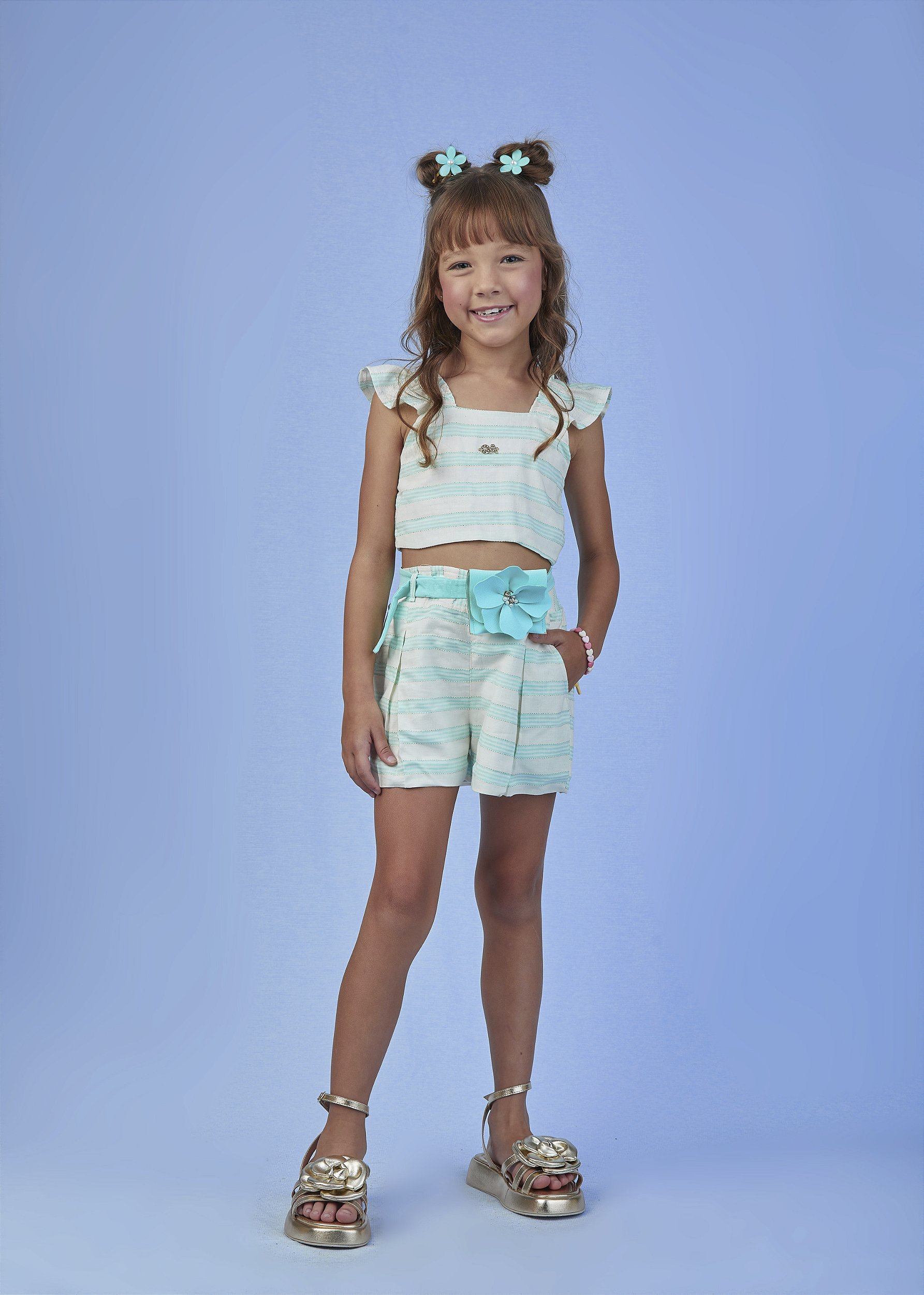 Este é um adorável Conjunto Infantil de 3 Peças da marca Gabriela Aquarela (P252217, disponível nos tamanhos 4 ao 14), perfeito para o verão e momentos de lazer, destacando-se pelos detalhes texturizados e cores suaves.
