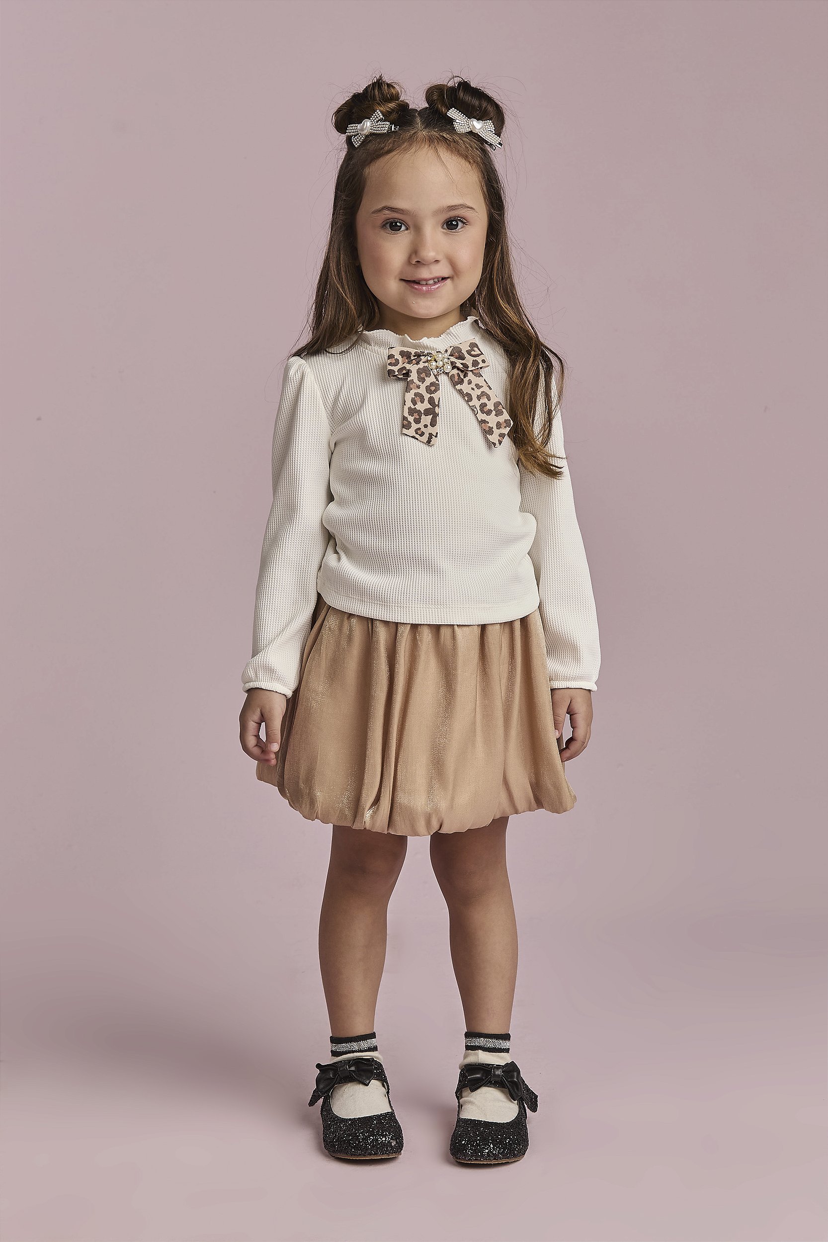 Conjunto feminino composto por saia estruturada em tecido bubble na cor amêndoa com brilho sutil. Acompanha blusa coordenada com estampa de animal print e detalhe de laço frontal, criando um visual romântico e atual.