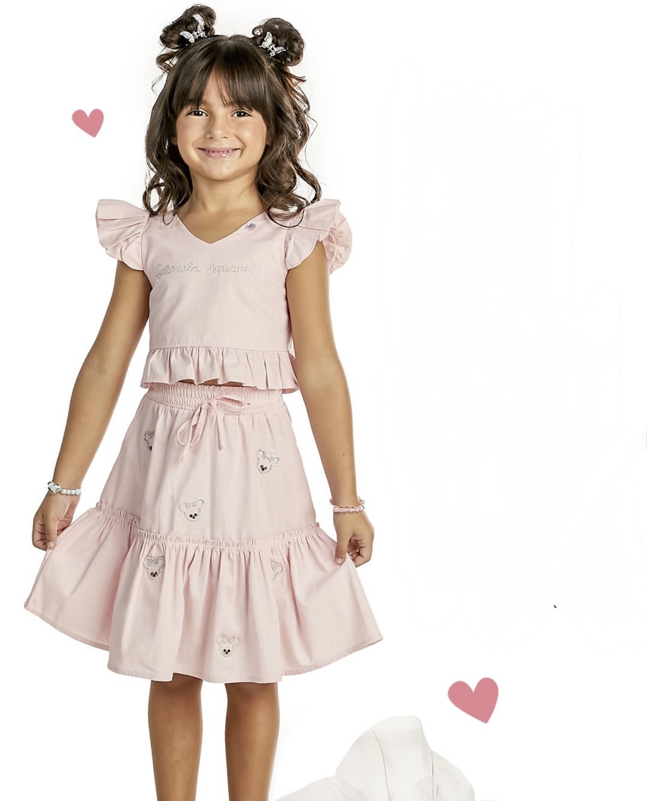 Conjunto Gabriela Aquarela delicado e cheio de charme, composto por cropped rosa com babado na barra, mangas curtas franzidas e bordado da marca, combinado com saia rodada no mesmo tom, com detalhe de amarração e bordados de carinhas de ursinho, criando um look doce e encantador.