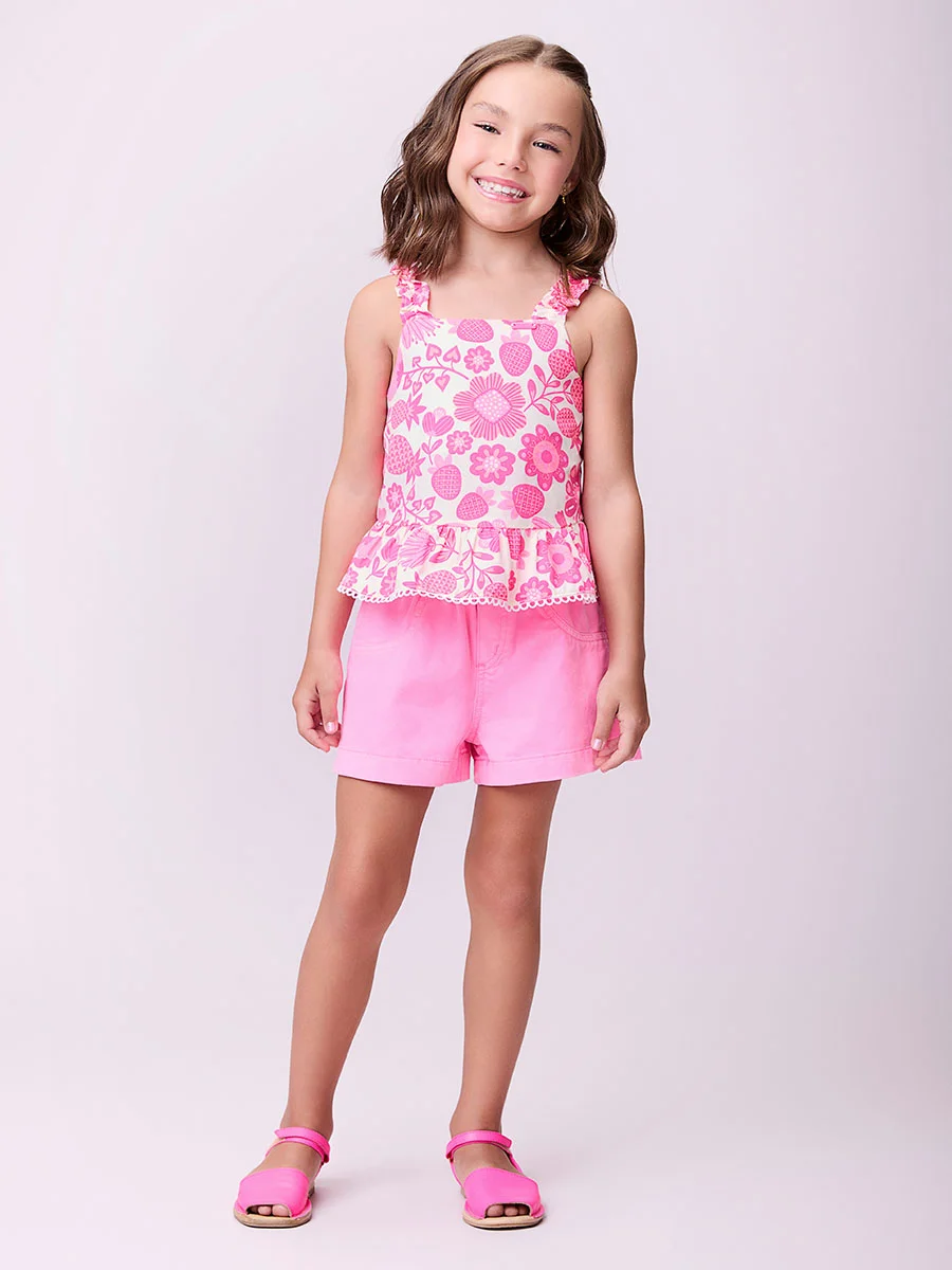 A Blusa: Confeccionada em tecido plano leve e fresquinho, ela se destaca pela estampa exclusiva em tons de pink sobre o fundo branco. O design traz um mix divertido de flores, borboletas, morangos e abacaxis, além da logo "MOMI" integrada delicadamente ao desenho. As alças possuem franzido confortável e a barra conta com um babado charmoso, finalizado com um acabamento delicado em passamanaria branca (estilo pom-pom).