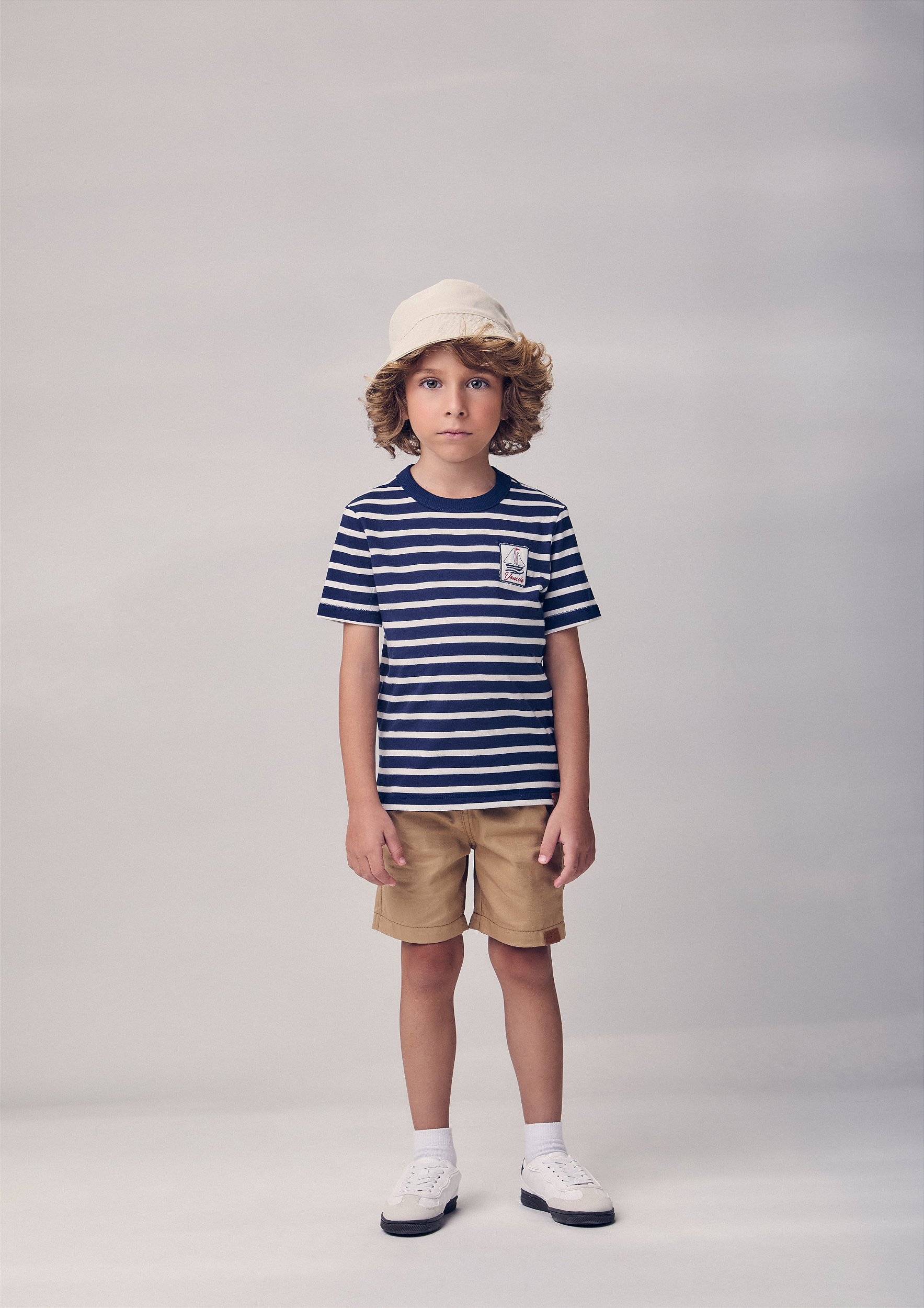 Conjunto t-shirt listrada azul marinho e bermuda bege