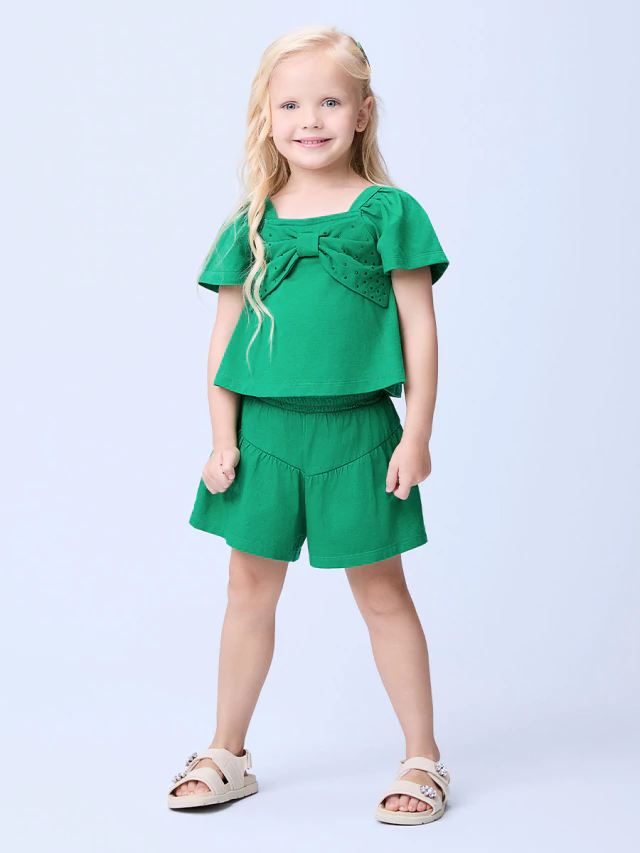 Conjunto Momi cheio de charme, composto por blusa verde com mangas amplas, decote quadrado e laço frontal com aplicação de pedrinhas, combinado com short-saia no mesmo tom, de modelagem fluida e cós com elástico para máximo conforto.