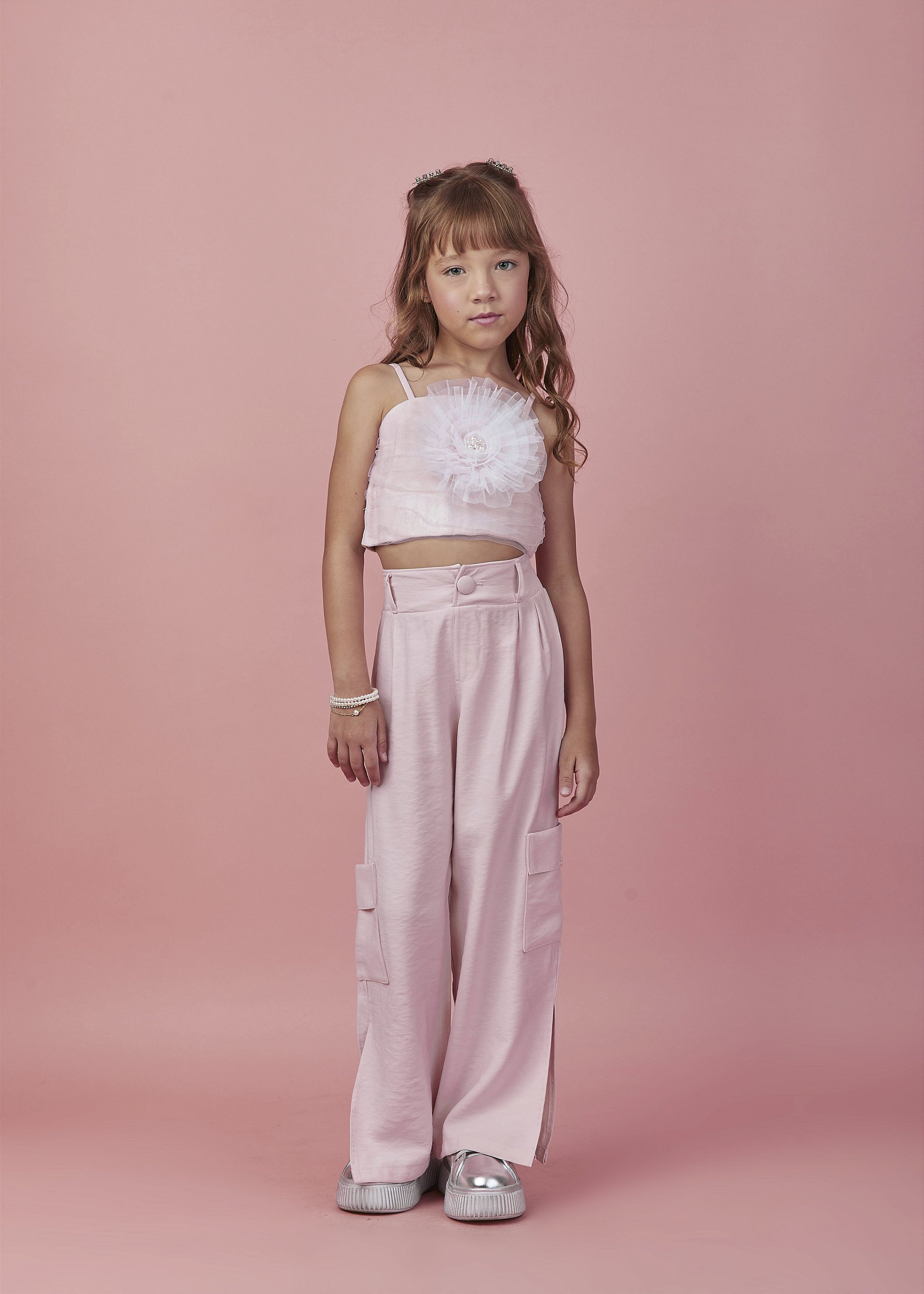 Modelo wide leg (perna larga), solta e fluida, também na cor rosa claro/bebê.