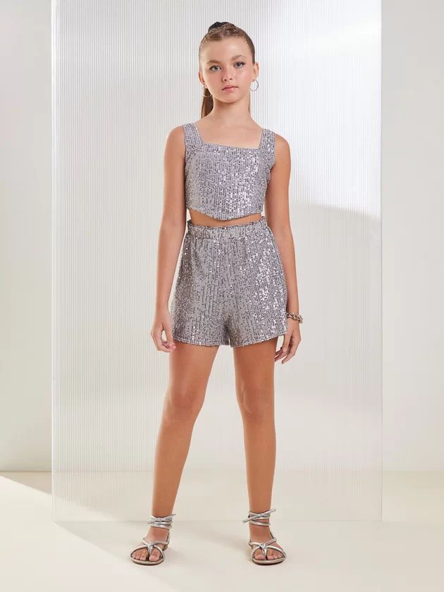O cropped cinza I Am é uma peça deslumbrante para garotas que desejam arrasar em suas produções de festa. Confeccionado em paetê com forro, ele brilha com elegância. O zíper nas costas facilita o vestir e proporciona um ajuste perfeito.