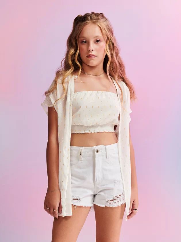 O Kimono I’am feito em tecido estampado com manga curta e faz diversas combinações de looks que as garotas vão amar. Nos detalhes traz modelagem alongada e plaquinha de metal personalizada da marca deixando um charme especial.