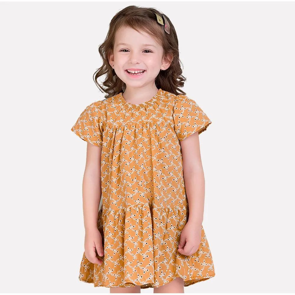 Opção delicada com a elegância do tecido laise O Vestido Infantil Milon é confeccionado em tecido laise, possui modelagem ampla, mangas com franzido, recorte de pala e barra com franzido, detalhe em gota nas costas com aplique de botão. Charme e conforto que a estação necessita.