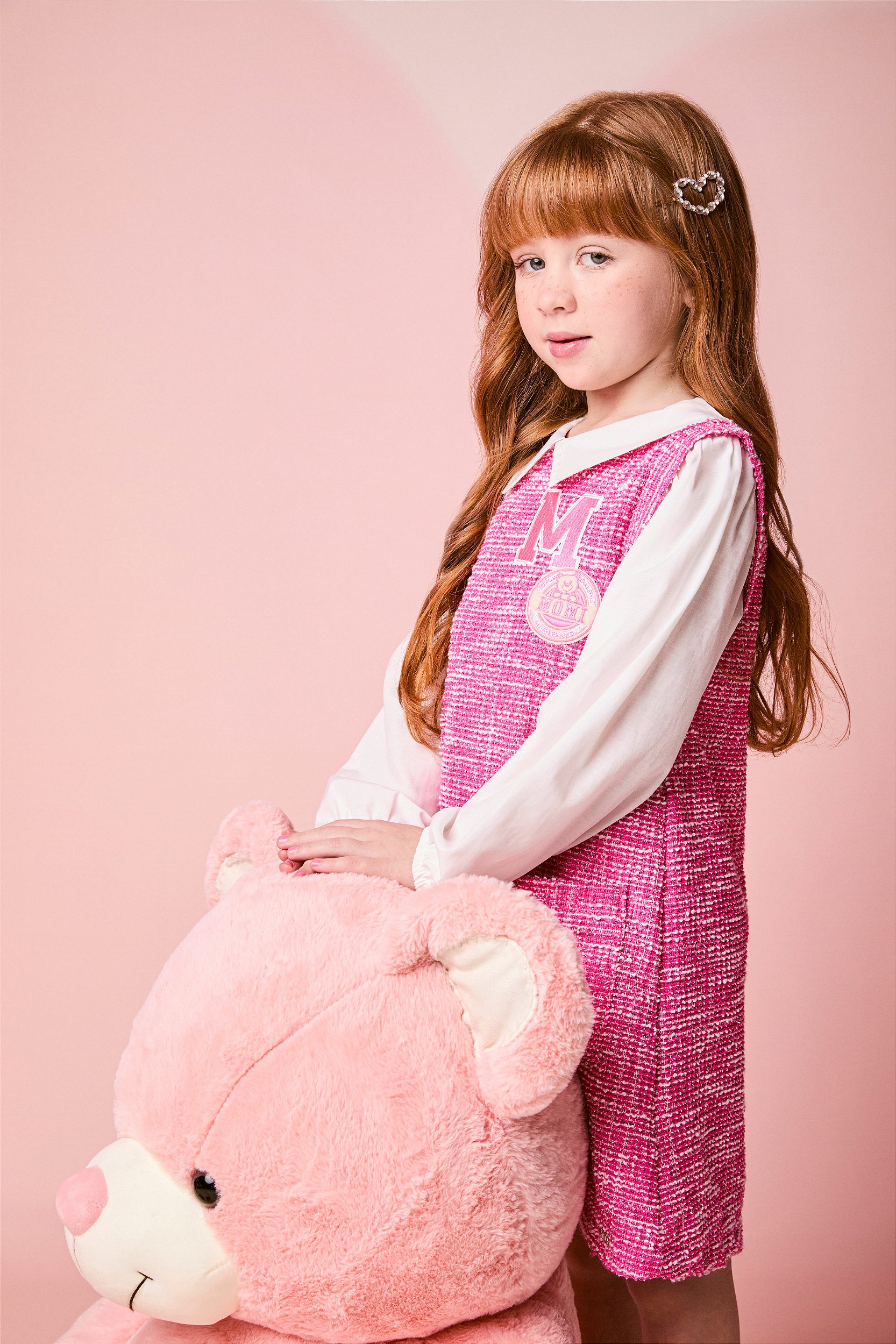 Vestido infantil de manga longa em tweed rosa neon e off white, com gola delicada para um visual quentinho e cheio de personalidade.